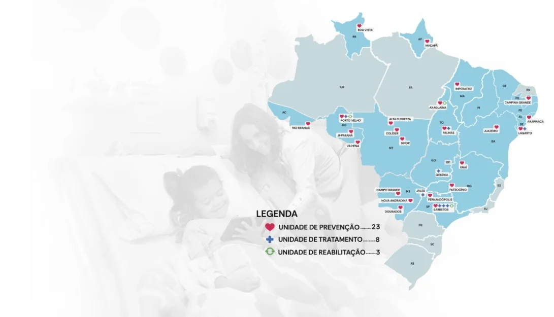 Estamos presentes em todo o Brasil, com unidades de Prevenção, Tratamento e Reabilitação, levando cuidado e excelência em saúde a milhares de pessoas.